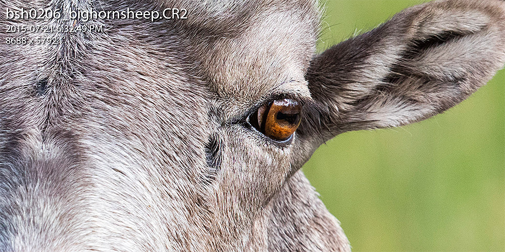 | A bighorn sheep ram in Kananaskis Country shot handheld ISO 640, 1/1250th at f5.6 with the Canon 5DS R |